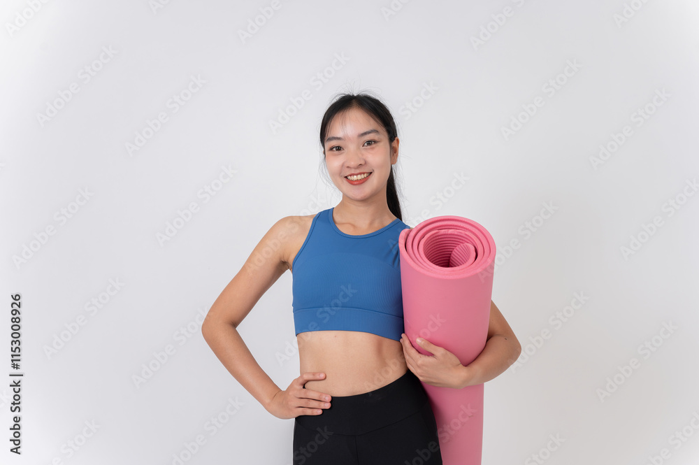 A confident, sporty Asian woman in sportswear holding her yoga mat against a white studio background