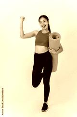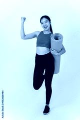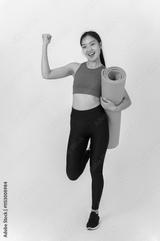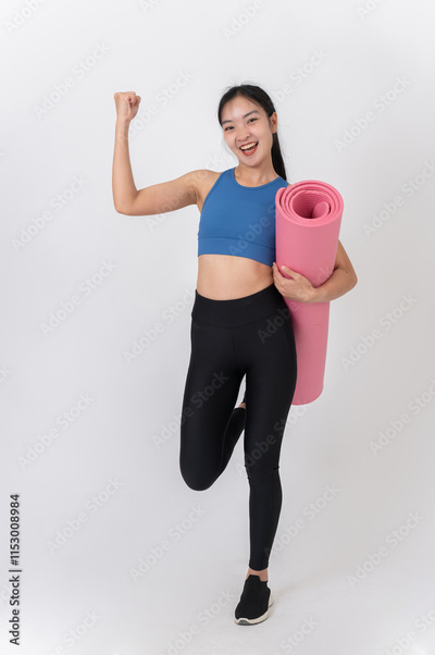 A full-body of a confident, slim Asian woman in sportswear holding her yoga mat, studio background.