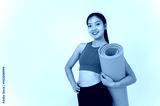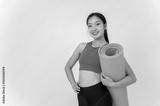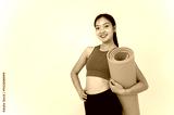 A confident, sporty Asian woman in sportswear holding her yoga mat against a white studio background