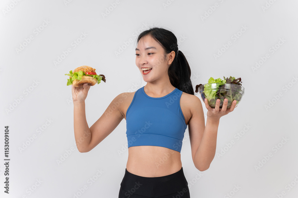 A cheerful Asian woman in sportswear holding a burger in one hand and a salad bowl in the other.