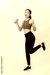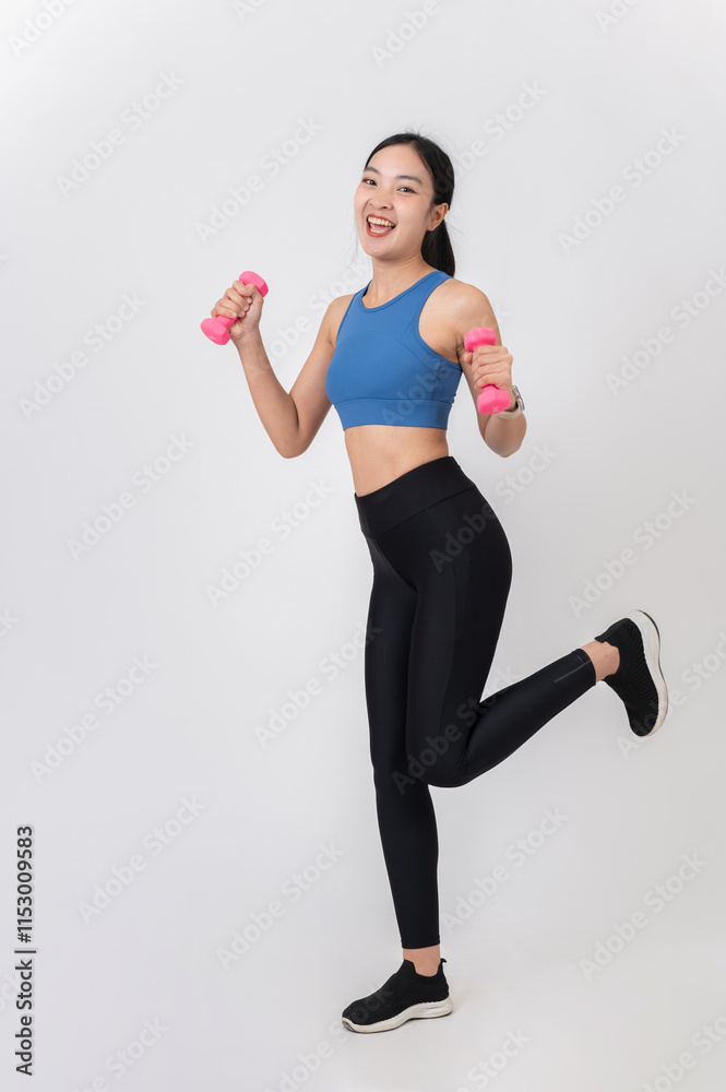 A cheerful young Asian woman in sportswear holding pink dumbbells on a white studio background.