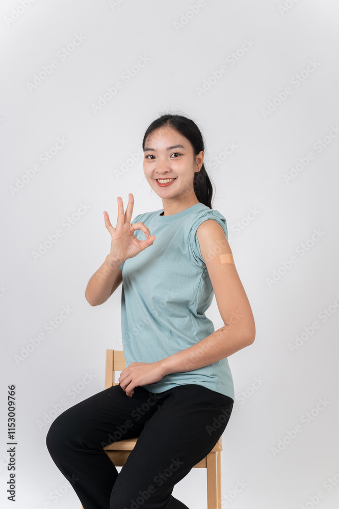 A carefree Asian woman showing her arm with a plaster adhesive bandage and giving a OK hand sign.