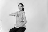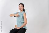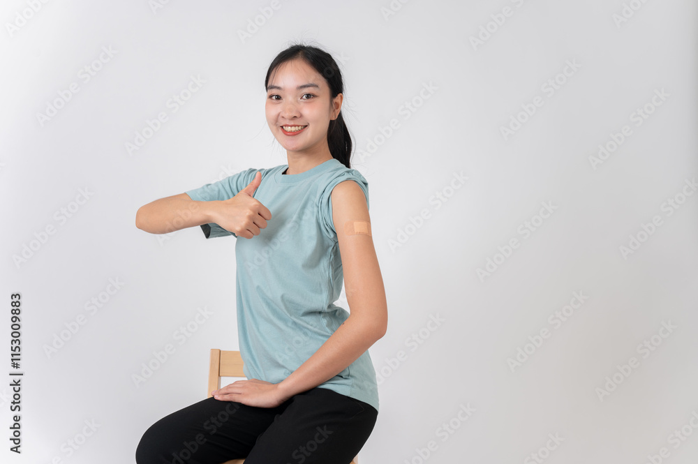 A carefree Asian woman showing her arm with a plaster adhesive bandage and giving a thumbs up.