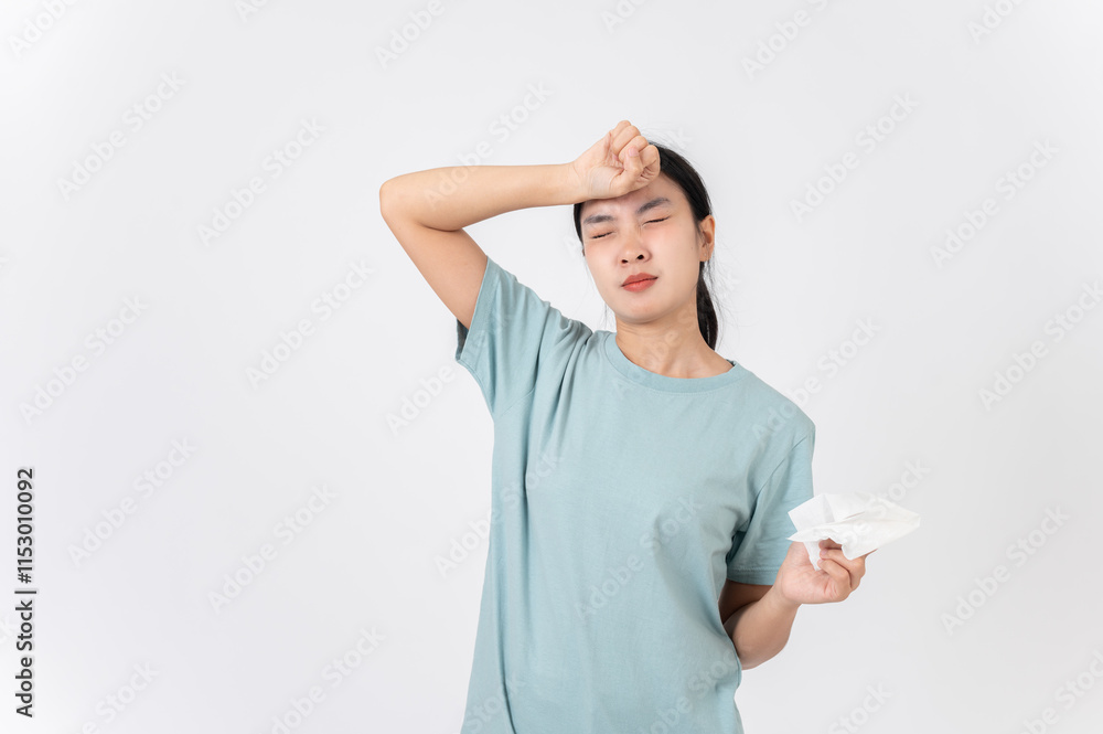 A sick Asian woman gently touching her forehead, suffering from a cold and fever.