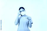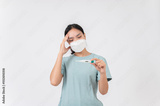 An uncomfortable, sick woman showing a thermometer indicating a fever to the camera, having the flu.