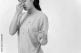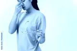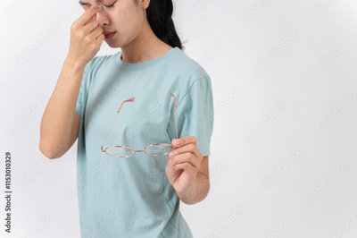 A tired, upset Asian woman taking off her glasses, suffering from eye strain, studio background.