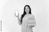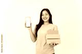 A woman standing against a white studio background, holding cardboard boxes and showing a smartphone