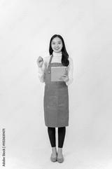 A beautiful female waitress or coffee shop staff in a brown apron writes order in a digital tablet