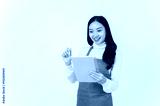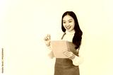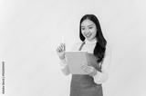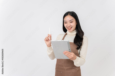 A smiling female waitress or coffee shop staff in a brown apron writes order in her digital tablet.