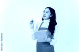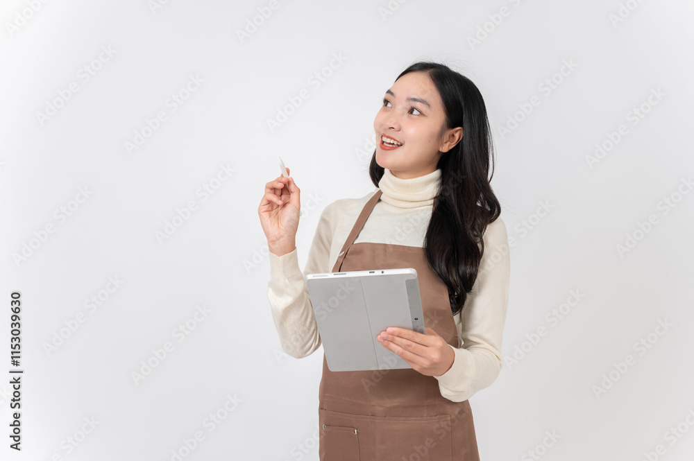 A charming Asian female cafe staff or waitress in a uniform holding a digital tablet, looking upward