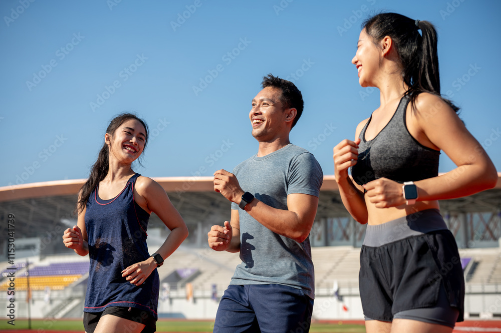 A group of cheerful Asian athlete runners enjoy a conversation while training at a stadium.
