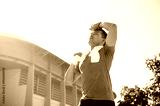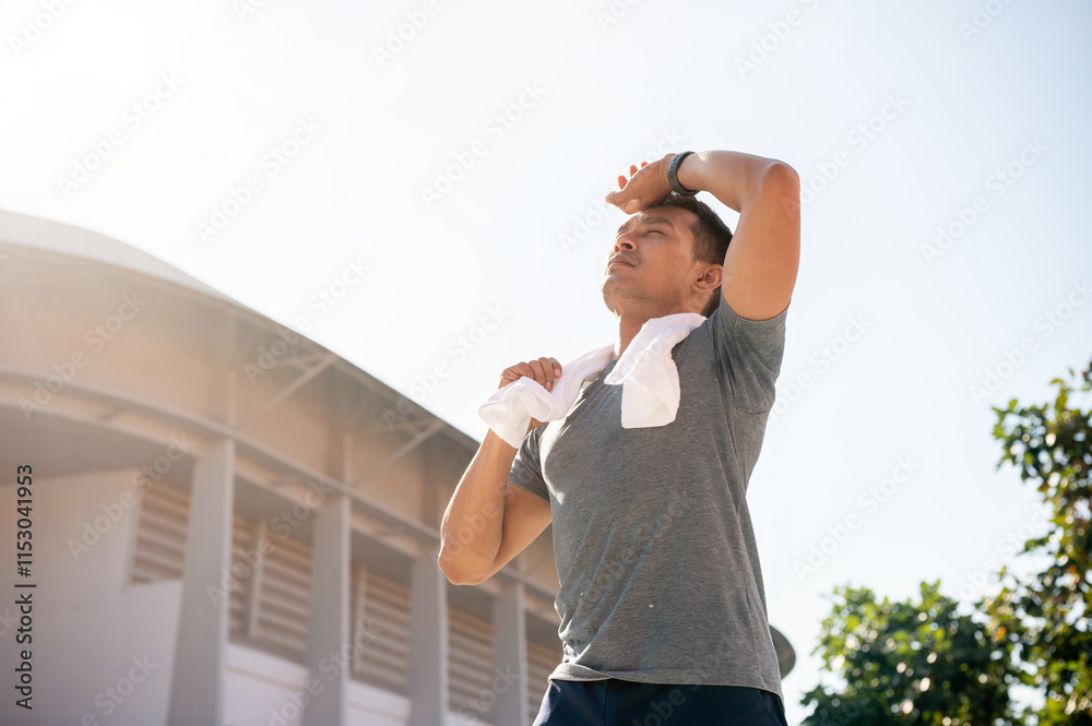 A tired, sweaty Asian man in sportswear, exhausted from running outdoors on a hot, sunny day.