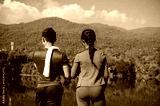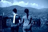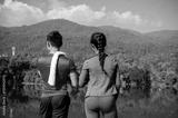 A back view of an Asian man and woman in sportswear, admiring the nature view in a park.