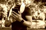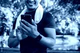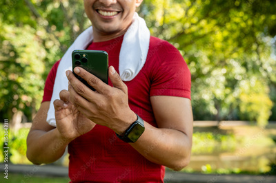 A cropped image of a sporty Asian man in sportswear using his smartphone while running in a park.