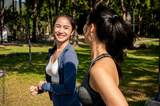 Two happy Asian female friends enjoy jogging together in a park on a sunny day.
