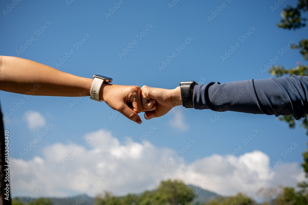 A close-up of two sporty individuals in sportswear and smartwatches giving each other a fist bump.
