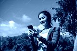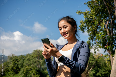 A sporty Asian woman in sportswear uses her smartphone while resting after jogging in the park.