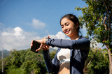 Sporty Asian woman in sportswear checks her calorie count on her smartwatch while running in a park.