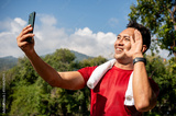 A happy, sporty Asian man in sportswear uses his smartphone while jogging in a park on a sunny day.