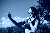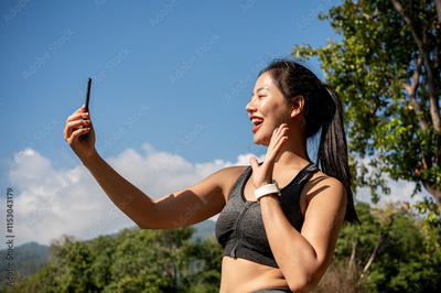 A cheerful Asian woman in sportswear takes a selfie on her smartphone while exercising in the park.