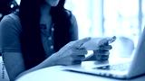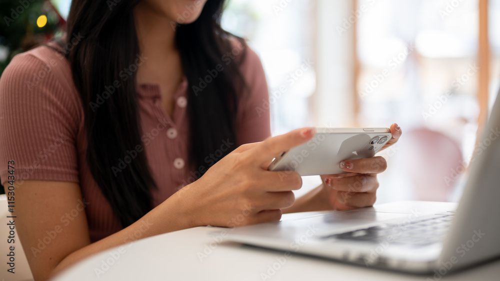 A close-up image of an Asian woman using her smartphone while sitting in a coffee shop.