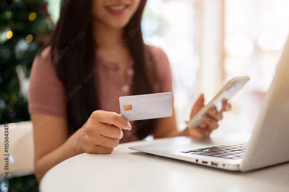 A close-up of an Asian woman holding the credit card and her smartphone while sitting indoors.