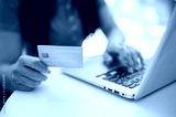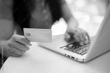 A close-up of a woman showing her credit card to the camera while using her laptop.