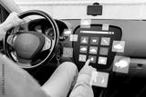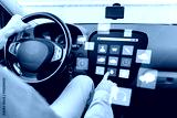 man driving car with menu icons on board computer