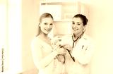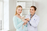 happy woman with cat and doctor at vet clinic