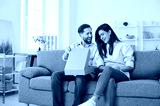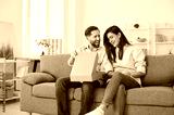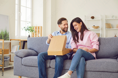 Young happy couple opening cardboard box sitting on sofa in living room at home. Man and woman buyers unpacking parcel receiving online store order. Delivery and shopping online concept.