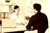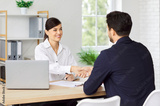 Two people sitting at office desk, making business deal and shaking hands. Smiling woman exchanging handshake with male client after signing contract, partner deal or employment agreement at meeting.