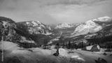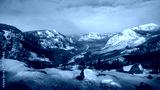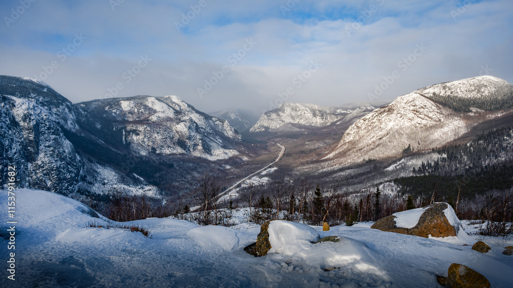 Hiking the Charlevoix snow covered mountains in winter, view over the valley of Grands-Jardins national park, Quebec, Canada