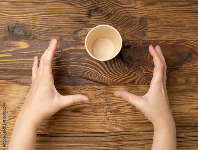 Hand Grabs Cup, Hands Reaching Empty Paper Cup, Coffee Mug, Cardboard Teacup, Hot Beverage Mockup
