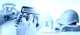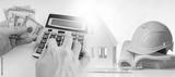 Accounting for construction costs. Architect hands with calculator. Accounting for costs of erection of house. Documents from helmet on architect desk. Calculation of cost of architect services
