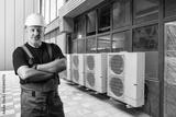 Man air conditioners repairman. Engineer near HVAC equipment. Man master near external units of air conditioners. Industrial ventilation system in building. Split equipment on glass wall