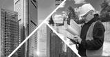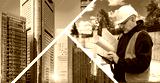 Man architect near skyscrapers. Construction company manager. Builders with phone near foundation. Man architect of high-rise buildings. Erection of modern real estate. Architect writes SMS to client
