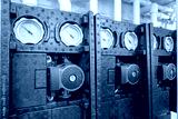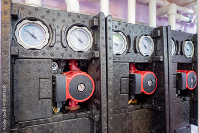 Fragment of boiler equipment. Pressure sensors on heating cauldron. Fragment of gas boiler with meters. Mechanical sensors near plastic pipes. Modern boiler system. Heating equipment for home