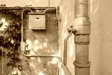 Gas pipes outside house. Yellow pipeline on wall. Gas pipes near box with meter. Equipment for home gasification. Wall with tree branches and pipes. Pipeline for supplying gas to residents house