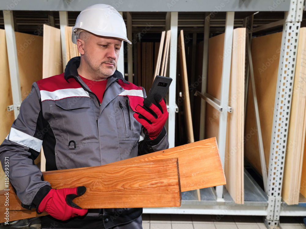 Man worker at furniture company. Woodworking worker. Phone and boards in hands of carpenter. Furniture production workshop specialist. Racks of plywood behind builder. Carpenter man in gray uniform