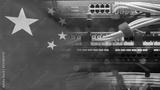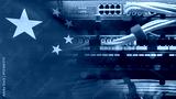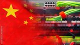 Chinese network equipment. Internet switch with fiber optic wires. Server equipment with flag of China. Green cables are connected to industrial router. Network technologies from China