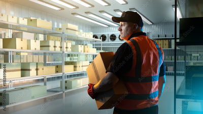 Man employee of cold storage warehouse. Freezer with boxes. Man brings container into refrigerator. Industrial refrigerator for freezing products. Large refrigerator in supermarket warehouse
