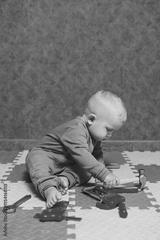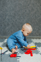 Boy 1 year old in a blue romper plays with toys at home in the living room. Child self-development. Toys for babies.