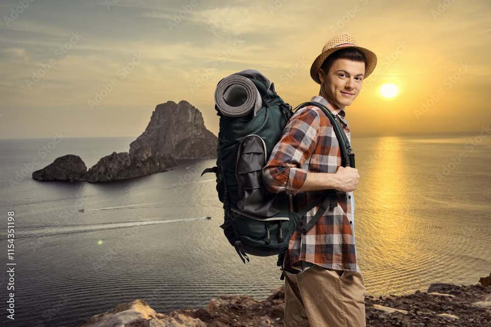 Young male hiker with a backpack standing on a cliff across Es Vedra on Ibiza island