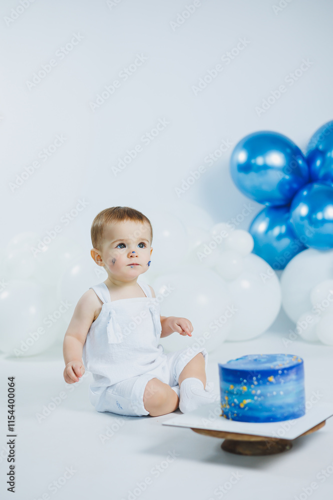 Boy's first birthday, sweet cake in nautical nautical style. Cheerful boy eating and breaking cake on his birthday.