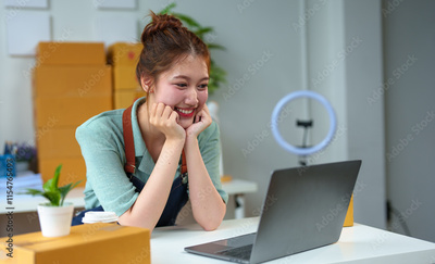 SME entrepreneurs, small businesses Online sales concept, happy Asian female business owner working on laptop computer and parcel boxes. Delivery of SME parcel boxes to customers Confirm order.