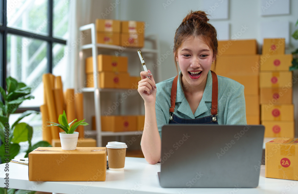 SME entrepreneurs, small businesses Online sales concept, happy Asian female business owner working on laptop computer and parcel boxes. Delivery of SME parcel boxes to customers Confirm order.