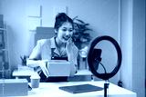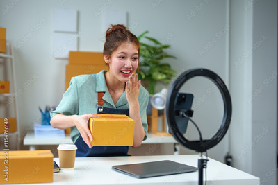 Asian woman, independent businesswoman, online sales, packs orders from customers who order through the website. Online sales, live broadcasting, e-commerce concepts.