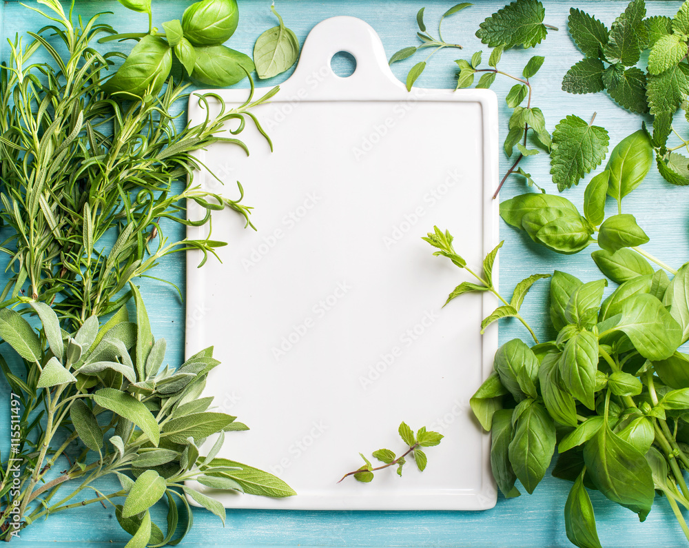Fresh green cooking herbal assortment. Sage, basil, rosemary, melissa and mint on blue background with copy space