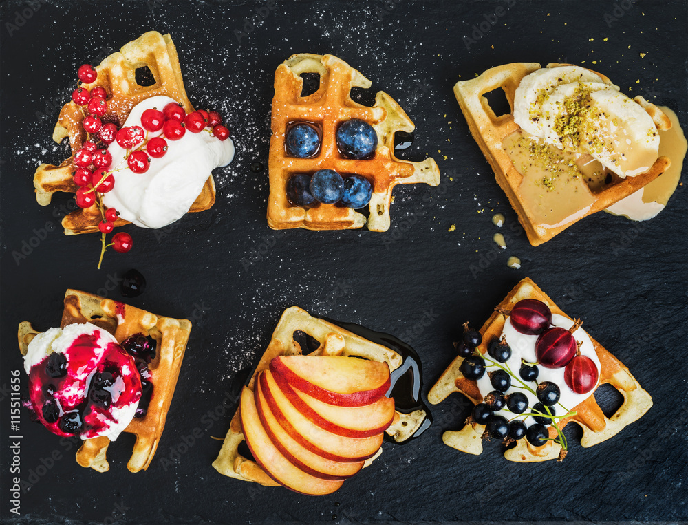 Warm belgian homemade waffles with fresh garden berries, fruit and ice cream on dark slate stone background