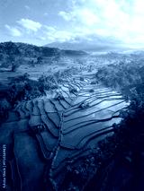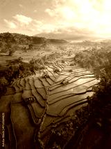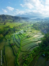 A Bali Countryside - Rice Fields and Mount Agung in the clouds. Tropical Nature and Sustainable Agriculture aerial view
